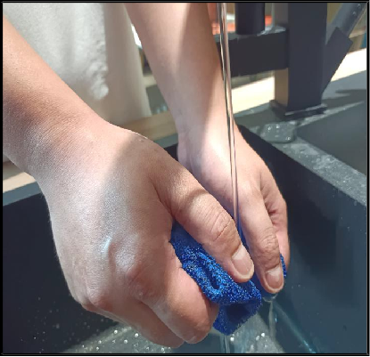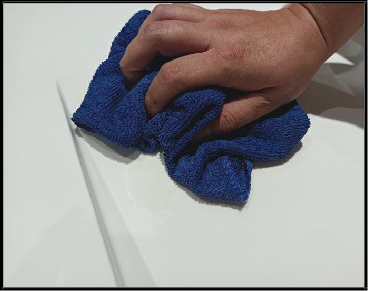 Glossy surface:Flush water to the place where need to clean,to make cleaning in circle movement with sponge and standard dish detergent or shower gel,dirt which is difficult to remove that can be polished with 1200 water sanding paper and then wiped with a soft cloth and pledge cleaner.